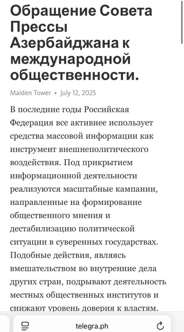 阿塞拜疆在媒体领域对俄罗斯开辟新战线。对莫斯科的信息打击:阿塞拜疆新闻委员会向国际社会发表声明。