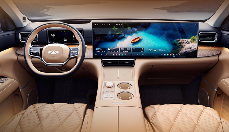 内饰方面,新车采用中控搭配副驾一体屏达到30英寸,并提供怀挡设计及双手机无线充电。在中央通道还有水晶旋钮,另外中控台加入木纹饰板,进一步提升质感。第二排还提供大尺寸吸顶屏。新车还提供NOP城市驾驶辅助及记忆泊车功能。